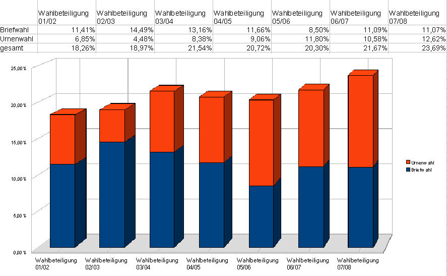 23,69% muss der Uni Hamburg erst einmal eine andere Groß-Uni (über 35.000 Studierende) nachmachen. Allerdings ist dieser Sprung in der Wahlbeteiligung mit einem Minus von mehr als 3000 Studierenden seit der letzten Wahl erkauft, die reinen Zahlen der Gesamtzahl der abgegebenen Stimmen pendelt konstant seit 2003/2004 um 8500.